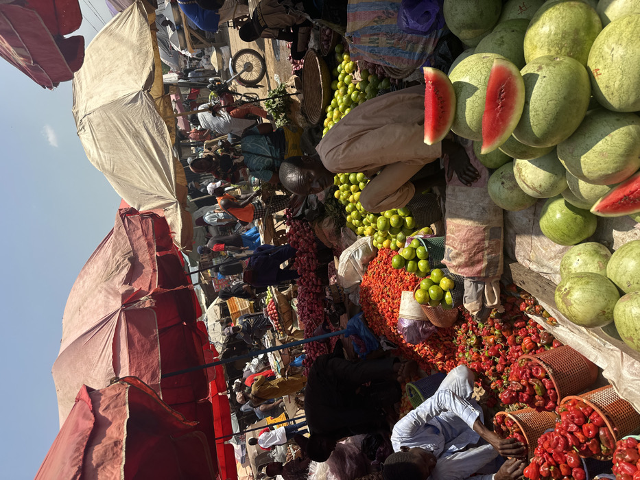 This image depicts a bustling open-air market in Karum, Nigeria, under a bright, clear sky