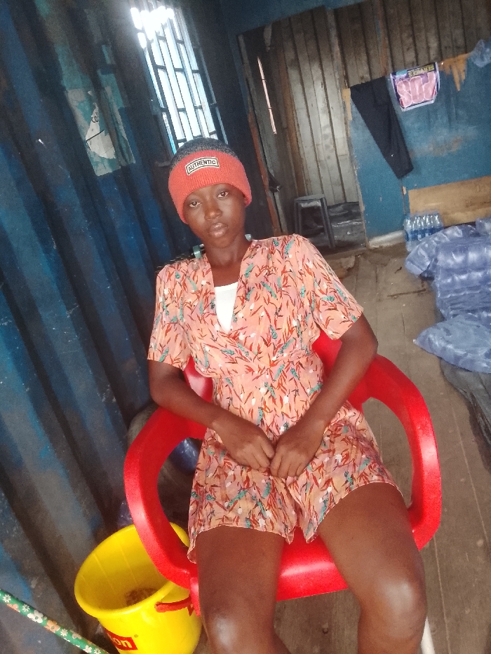 A young individual, appearing female, with dark skin, is seated facing forward on a red plastic chair. She wears an orange knit beanie with a white "AUTHENTIC" label and a short-sleeved, patterned peach-colored romper over a white undershirt. Her hands are clasped in her lap. The setting is an indoor space within Umuahia, Nigeria. To the subject's left, a corrugated blue wall is visible, with a barred window admitting bright light behind her. The background features a vertical plank wall, also blue, with dark trousers hanging on the right. Below the hanging trousers, a stack of clear plastic bags containing water sachets or bottles rests on a surface. A yellow plastic bucket containing light-colored granular material, labeled "Lipton," is on the floor to the subject's left. The floor is dark and uneven.