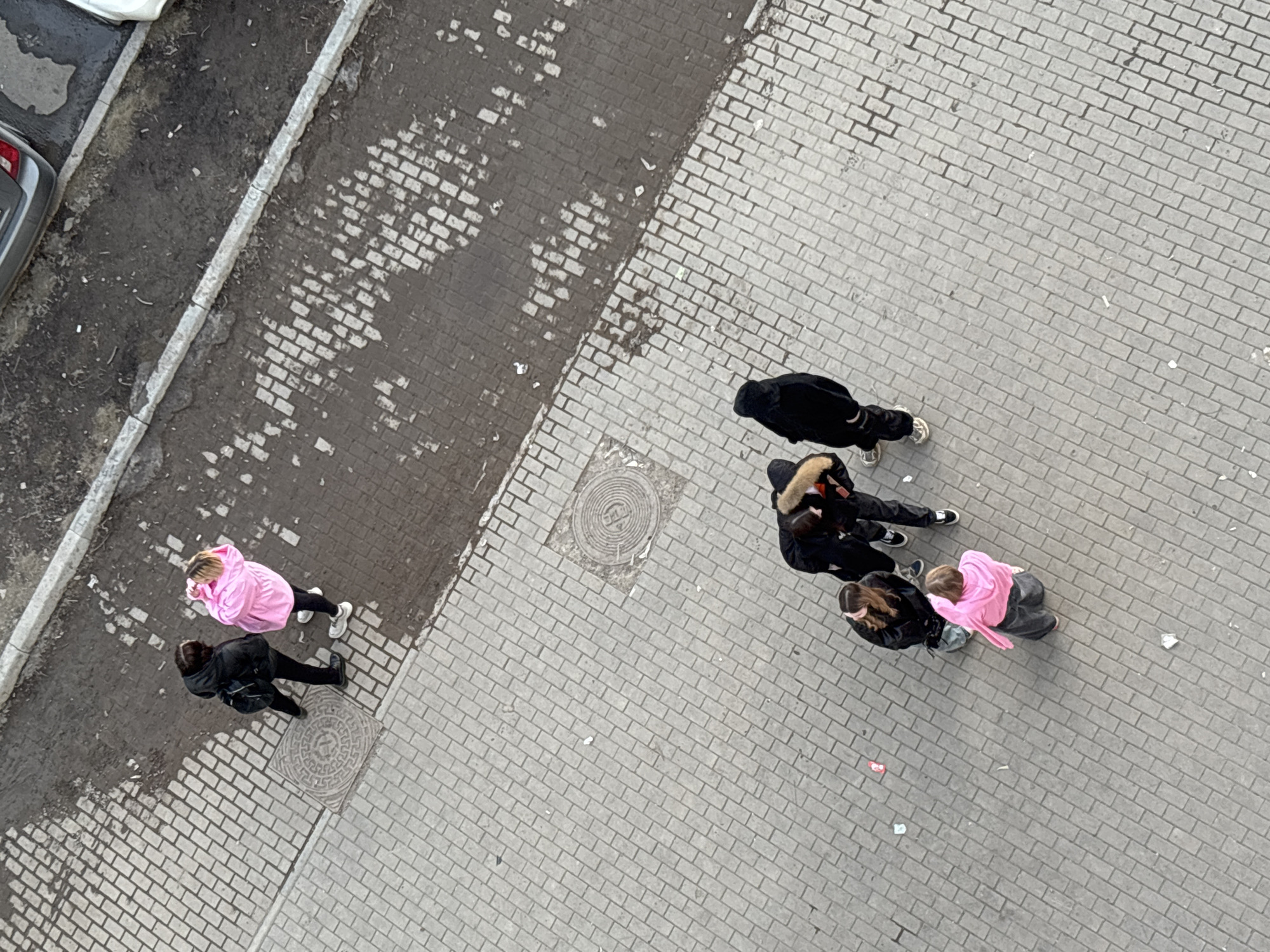 Viewed from above, the image depicts a paved area in what appears to be an urban environment, possibly Chaikovsky, Russia, based on the provided information. The paving consists of grey brick, clean in the main area, and dirty on one side. At the top left of the frame, is visible the edge of a car and a small section of curb and road. Six individuals are present, divided into two distinct groups. The group on the left of the frame consists of two people. One is dressed in a pink jacket. The other wears a black jacket. They stand on dirty paving with a manhole cover visible underneath. The group on the right of the frame consists of four people dressed in dark clothing, including jackets with fur trims. One individual is wearing a pink jacket. The groups are separated by a patch of paving with a manhole cover underneath.