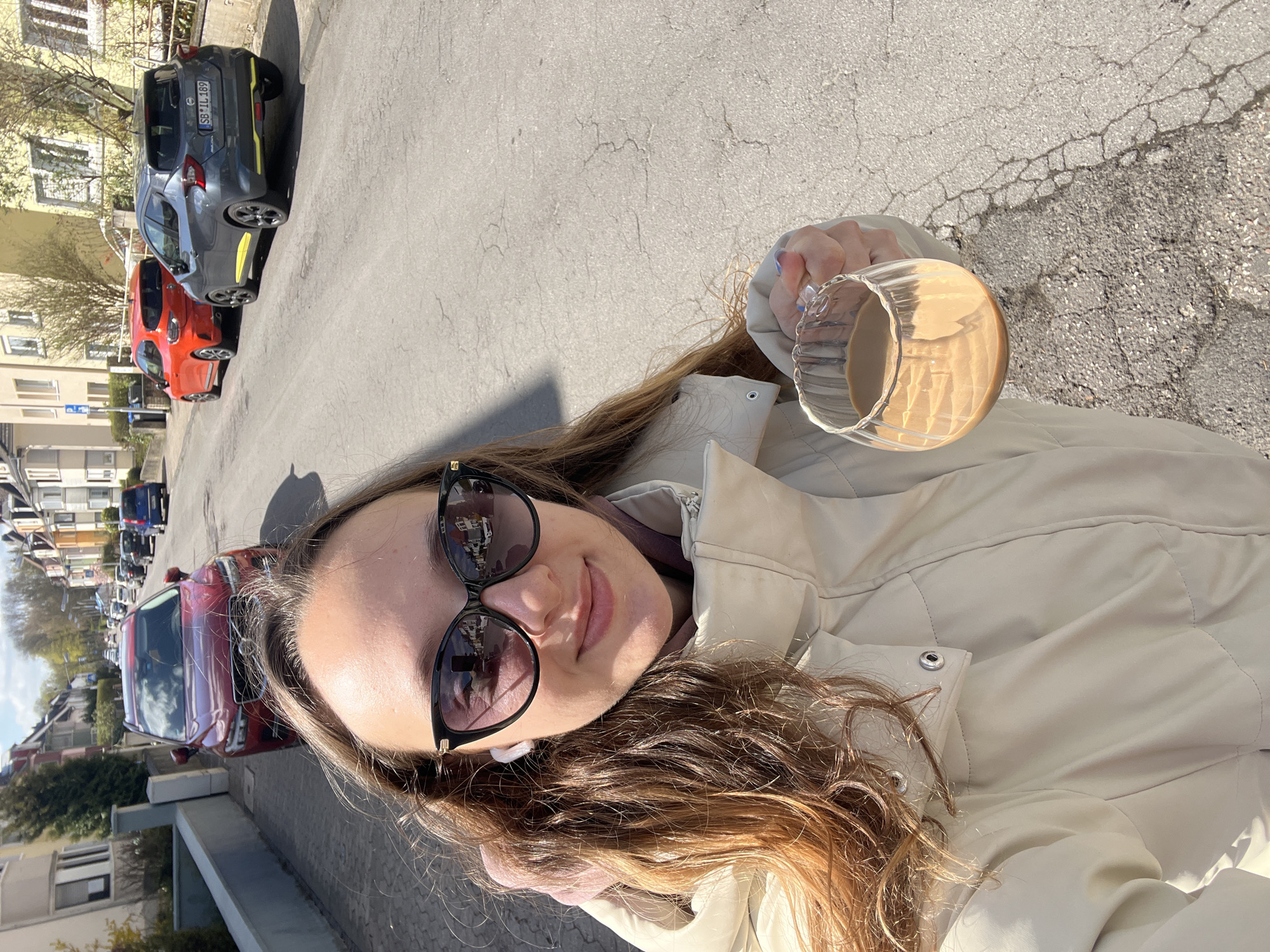 The image depicts a female subject taking a selfie on a residential street in Saarbrücken, Germany, under bright sunlight. The subject, positioned centrally and looking directly at the camera, has long brown hair with lighter highlights, wears large black-framed sunglasses that reflect the street scene, and a white wireless earbud in her left ear. She is dressed in a light beige or cream-colored puffer jacket, with a darker garment visible at her neck. Her right hand, with light blue nail polish on some fingers, holds a clear glass mug with a ribbed texture containing a light brown beverage. The scene unfolds on an asphalt road exhibiting minor cracks. Parked vehicles line both sides of the street: a dark red SUV is visible on the left, facing away from the camera. On the right, a gray Nissan Micra hatchback with yellow side skirt and rear bumper accents is parked, displaying the German license plate "SB IL 189," confirming the location as Saarbrücken. Behind it, a red hatchback is also parked. Further down the street, additional cars are visible. The street is bordered by multi-story residential buildings of varying light colors (yellow, cream, white), some with visible windows and balconies. Sparse trees and shrubs with budding leaves are present along the sidewalks. The sky is partly cloudy. Shadows are cast on the street, consistent with the sunny conditions.