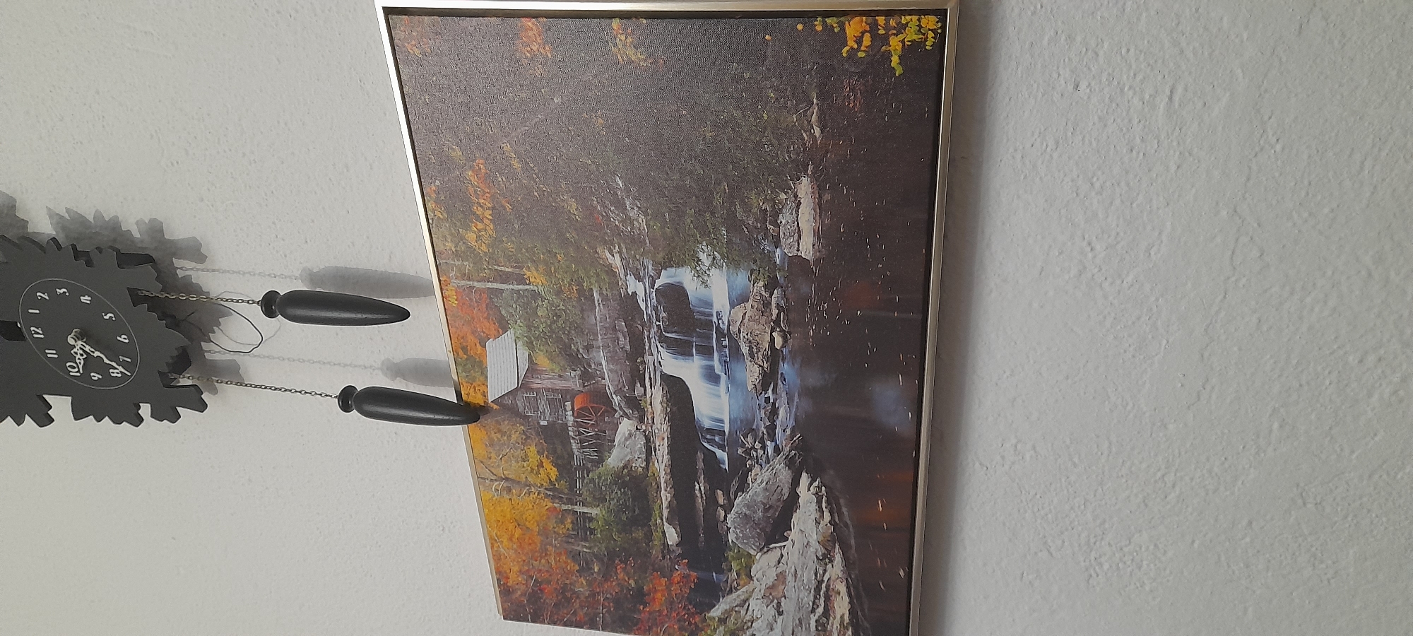 An overhead, slightly angled view captures a section of a light grey, textured interior wall. Mounted centrally near the top is a dark, stylized cuckoo clock with a twelve-hour face displaying black Arabic numerals and hands, indicating approximately 10:10. Two black, conical weights suspended by metal chains hang from the bottom of the clock. Directly below the clock, a rectangular framed artwork is mounted on the wall. The artwork is bordered by a thin, metallic-colored frame. The image within the frame depicts an autumn landscape featuring a rustic wooden mill with a red water wheel positioned on the left, surrounded by trees with orange and yellow foliage. A multi-tiered waterfall flows over rocks into a dark river or stream in the mid-ground and foreground. The clock weights partially overlap the top edge of the framed artwork. No people are visible. The scene is located in an indoor setting, specific city and state unknown.