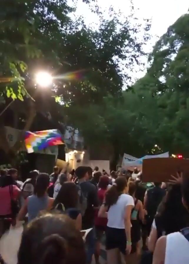 A crowd of people is walking down a street lined with trees, their backs to the camera. Some are carrying signs, and one person is waving a rainbow flag. The street is illuminated by a street lamp. The sky is overcast.