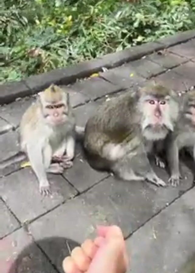 person interacting with three monkeys sitting on a tiled surface next to green plants. The person is holding their hand out towards the monkeys and one of the monkeys reaches out and touches the person's hand. The person then opens their hand, palms up, to show that they have nothing in their hands. The monkeys remain on the tiled surface. The camera angle is from the person's point of view.
