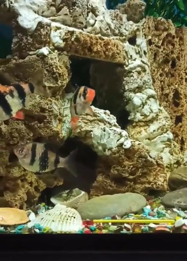 fish tank with several tiger barbs swimming inside. The tank is decorated with large, porous rocks that form a cave-like structure. The bottom of the tank is covered with pebbles, shells, and a few larger stones. There are also some plants visible in the background of the tank. The tiger barbs are the main subject of the video, and they can be seen swimming around and interacting with the rocks and other decorations in the tank.
