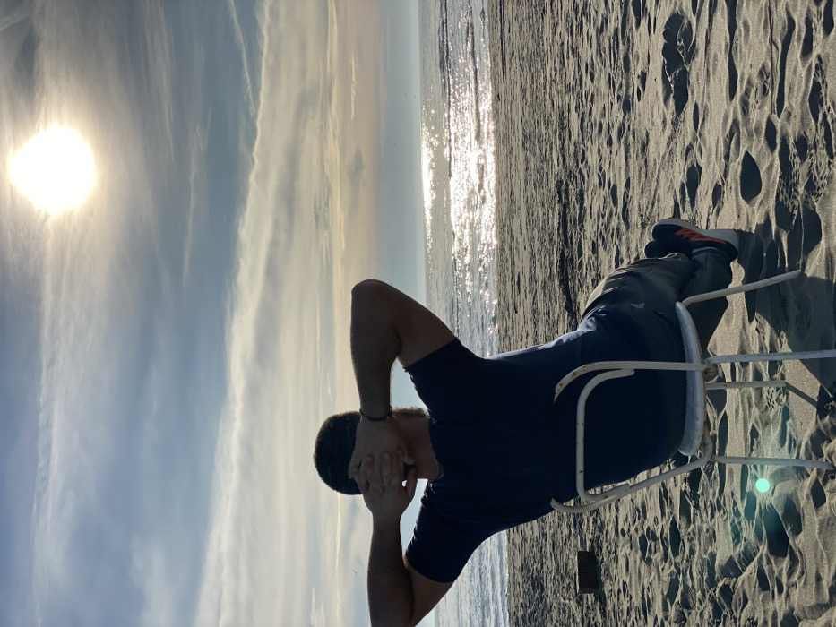 A man sits in a white chair on a sandy beach, facing away from the camera. He wears a dark blue shirt and gray pants. His hands are covering his face. The sun is bright in the sky, partially obscured by wispy clouds. Sunlight glints off the surface of the water beside the beach. A dark object is visible on the sand near the chair's leg. The image is oriented in a portrait style.