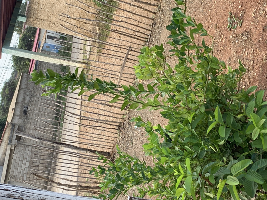 A lush green shrub with broad, oval leaves dominates the right side of the frame. Adjacent to it is a dirt path and a rudimentary wooden fence constructed of thin, vertical stakes. Behind the fence, a cinder block building is visible. In the distance, a glimpse of a blue and red structure is seen. The ground is a mix of dirt and sparse vegetation. The image is shot from a slightly elevated angle, showcasing the natural and built environments in an informal setting.