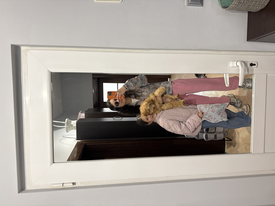 The image depicts an indoor scene within a residence in Blagoevgrad, Bulgaria, captured as a mirror selfie. The primary subject is a large, white-framed mirror embedded in a white door, reflecting two females and a small dog. An adult female, positioned on the right side of the reflection, is taking the photograph using an orange-cased smartphone held in her right hand. She wears dark sunglasses, a patterned long-sleeved jacket, and pink sweatpants, with chunky grey and white athletic shoes. Her left arm supports a small, light brown, curly-haired dog. To her left, a young female stands, smiling towards the camera. She wears a light pink quilted jacket, light blue jeans, and light-colored sneakers. She holds a white fabric item with a light floral pattern in her left hand. The reflected background behind the subjects includes a dark brown wardrobe or cabinet on the left, topped with a white decorative basket and another light-colored object. A shoe rack holding multiple pairs of light-colored shoes or slippers is visible on the floor to the left of the young female. The reflected floor is tiled in a light brown hue. Outside the mirror's frame, the surrounding wall is light grey. On the right, a segment of a dark brown table or cabinet is visible, topped with a woven basket containing green and white striped fabric. A white door handle with a keyhole is present on the right edge of the mirror's frame. A white door hinge is visible on the upper left edge of the mirror's frame.