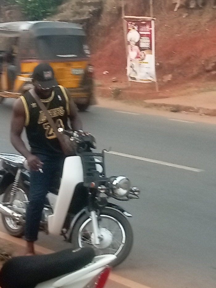 A dark-skinned man in a Lakers jersey, jeans, and a baseball cap sits on a black and white motorcycle. He's holding a lit cigarette. A brown messenger bag is slung across his shoulder. A yellow auto rickshaw is in the background, and a poster stands on a pole near a reddish-brown hill. The scene is on a paved road. Another motorcycle is partially visible in the foreground.