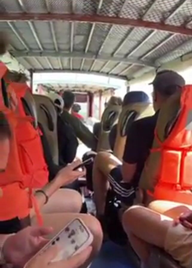 interior of a boat with rows of seated passengers wearing orange life vests. Many are looking at their phones. The boat is moving through a river or body of water with green, tree-covered mountains on the side. The sky is clear and blue. The boat's wake is visible.