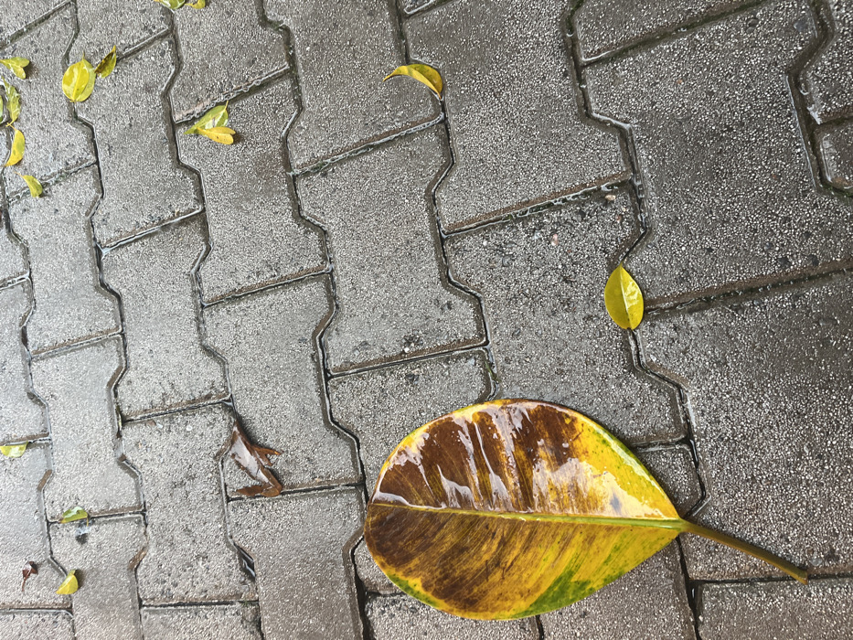 The image provides an overhead view of a wet, grey paved surface, consistent with an outdoor pathway or sidewalk