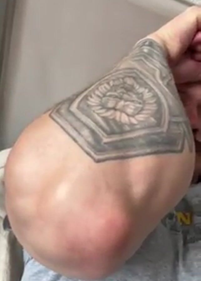 person’s arm bent at the elbow, with a large swollen area around the elbow joint. The person’s arm has a gray tattoo on the upper forearm. The person in the video has a mustache and is wearing a gray t-shirt. The background includes a white wall and part of a couch.