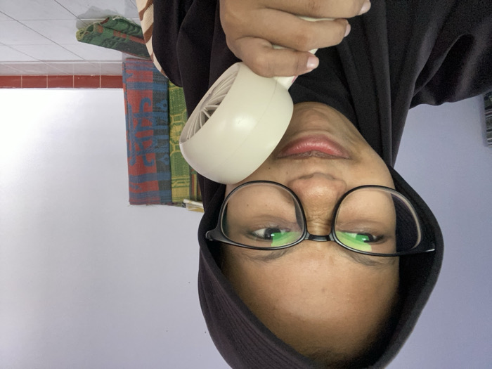 A person wearing a black hooded garment and glasses holds a small, white handheld fan close to their face. The background shows a white and blue wall, with colorful, folded mats or blankets stacked against the wall to the left. The camera is pointed slightly upward, creating a perspective where the person appears upside down. The lighting is bright, highlighting the features of the person's face and the details of the items in the background.