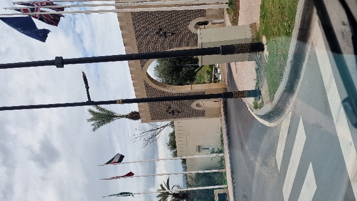 The scene depicts the entrance to the Hotel Sahrai in Fez, Morocco. In the foreground, a segment of an asphalt road features a white-striped pedestrian crossing. A concrete curb separates the road from a narrow strip of grass on the right, where a drainage grate is visible. The bottom edge of the image shows a reflection, likely from a vehicle's interior. The midground is dominated by two tall, black street light poles, each with a modern light fixture and distinctive gold-patterned banding near its base. Behind these poles stands a cream-colored fortified wall, consistent with Moroccan architectural style, topped with battlements. This wall features a prominent central arched gateway, which is adorned with intricate dark geometric patterns within its frame. Two ornate black metal lanterns are mounted on either side of this large arch. A smaller, plainer arched opening is visible further left along the wall. A palm tree is positioned behind the left flagpole, and another is visible to the far left, behind a section of the wall. Against the overcast sky, five flagpoles are visible. From left to right, the flags include a green standard (possibly Saudi Arabia), a red and white flag, a black-white-green-red horizontal striped flag with a red triangle on the hoist side (likely Palestinian or Jordanian), a blue flag with yellow stars (European Union), and a Union Jack (United Kingdom). The background reveals hilly terrain covered with sparse green vegetation and trees. The sky is largely overcast with scattered grey and white clouds. No individuals are present, and no specific actions or interactions are depicted.