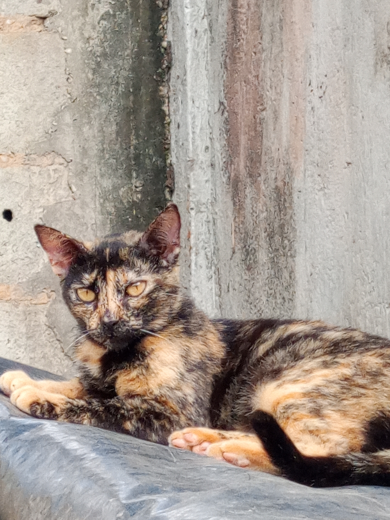 A tortoiseshell cat is reclining on a dark gray surface. The cat has amber eyes and a mix of black, brown, and orange fur. The background is a mottled gray wall. The location is Tinaquillo, Venezuela.