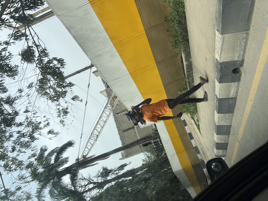 An urban street scene in Falomo, Nigeria, depicts a lone male subject walking on a concrete sidewalk adjacent to a construction site under an overcast sky. The man, wearing an orange t-shirt, dark pants, and dark sandals, carries a dark-colored object slung over his right shoulder and holds a thin, dark stick-like object in his left hand, pointing downwards. He is walking from the right to the left of the frame. To his right, a corrugated metal barrier painted with horizontal white, yellow, and brown stripes encloses a construction area. Beyond the barrier, a white lattice crane structure is visible above an unfinished building constructed with grey concrete blocks. Tall palm trees and other trees with green foliage stand in the background and foreground, bordering the construction site. A curb with alternating black and grey blocks separates the sidewalk from a paved road, which features a yellow line, visible in the lower foreground. The image is captured from inside a vehicle, with part of a car door and rearview mirror visible in the bottom left corner.
