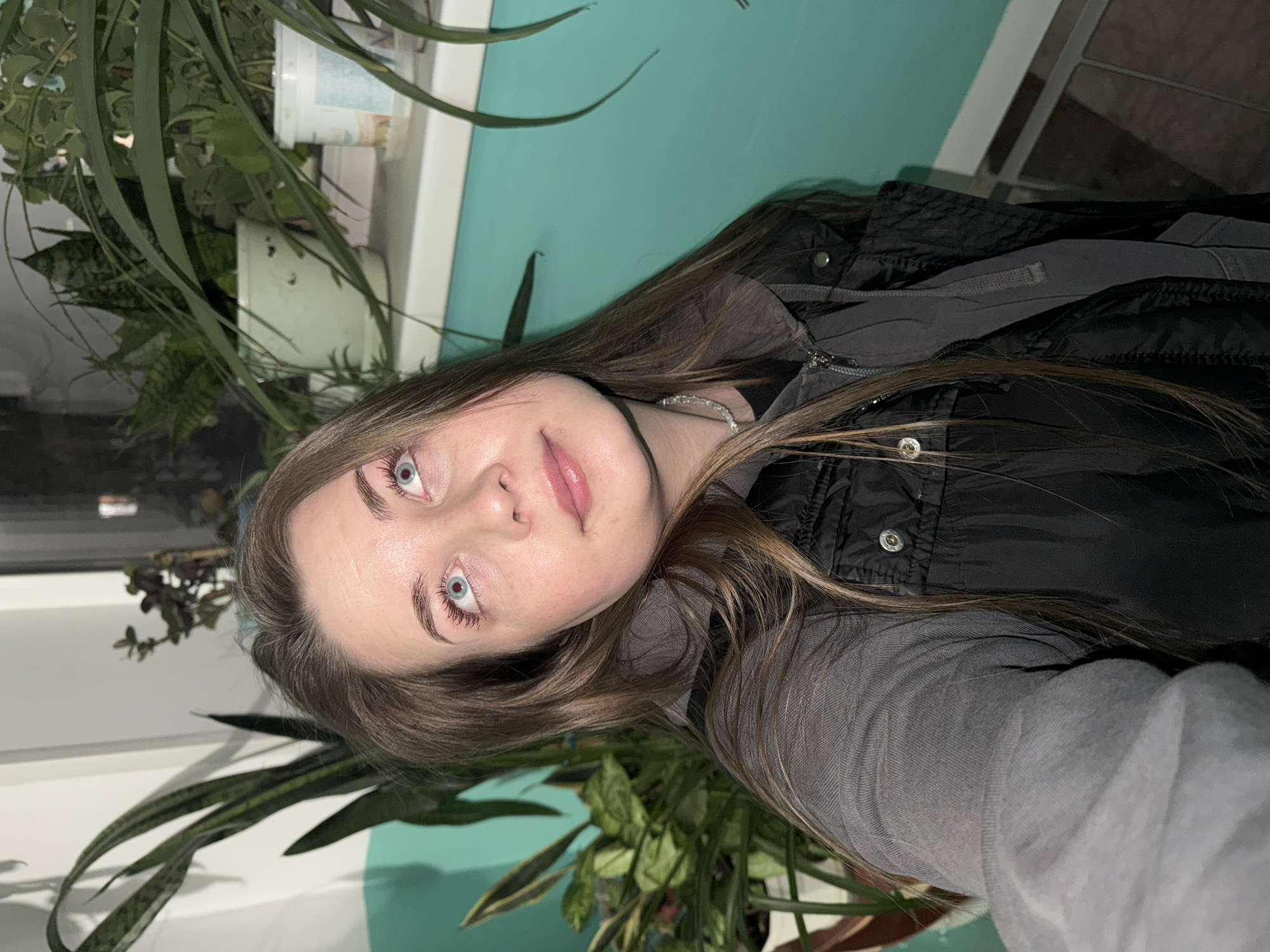 A young woman with long brown hair, light skin, and blue eyes is positioned in front of a window with houseplants