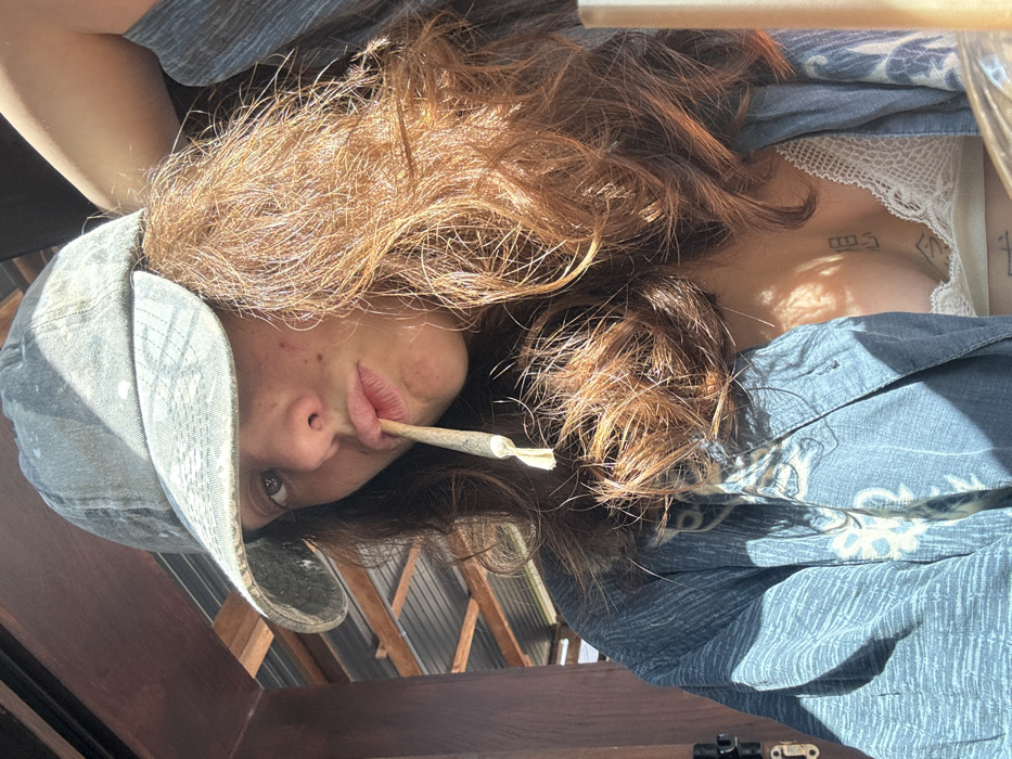 A close-up portrait shows a young individual, presumed to be in the city of Pai, Thailand, looking directly at the camera. The subject has long, wavy, reddish-brown hair and is wearing a light-colored baseball cap. A hand-rolled cigarette is held between their pursed lips. The individual wears an open, patterned blue shirt over a white lace bralette, with a tattoo visible on their chest. The background features wooden structural elements and a corrugated roof, illuminated by strong natural sunlight that casts distinct shadows.