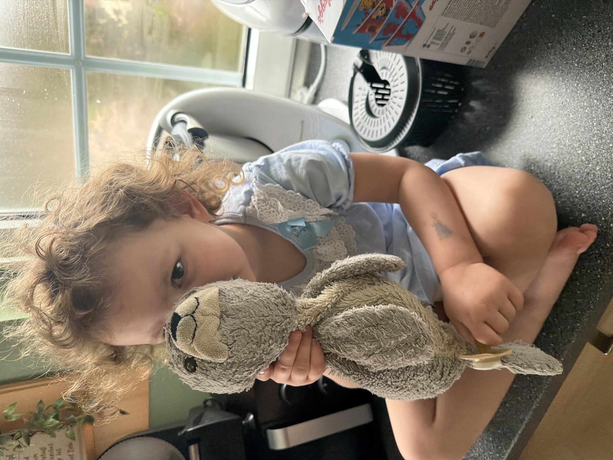 The scene is set indoors, within a residential kitchen in what is identified as Trassem, Germany. A young child with curly light brown hair and fair skin is seated cross-legged on a dark gray speckled countertop. The child wears a light blue top featuring white lace trim and a small blue bow on the right shoulder. They are holding a gray, well-worn plush toy, resembling an otter or seal, in both hands, positioned directly in front of their face, partially obscuring it. One of the child's eyes is visible, looking towards the viewer. A faint, possibly temporary, blue mark is present on the child's right forearm. A light-colored plastic clip or tag is attached to the tail end of the plush toy. In the background to the left, a dark appliance, a wooden frame, and a hanging green plant are partially visible. To the right, a white kitchen appliance (possibly a stand mixer) and a dark gray circular kitchen accessory with a handle are present on the counter. A window with white mullions shows a blurred exterior scene, possibly greenery, and water droplets on the glass. A partially visible white and blue Kellogg's brand box is on the far right of the counter.