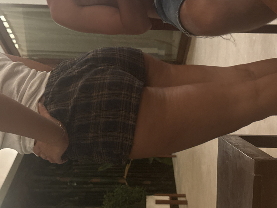 The image depicts an indoor or semi-outdoor setting in General Luna, Philippines, likely during evening hours due to dim lighting. Two individuals are partially visible. On the left, a person stands facing slightly away from the camera, exhibiting tanned skin, wearing a white tank top and dark plaid shorts. Their right hand is placed on their hip, and a ring is visible on their right ring finger. To the right, a second individual is partially visible, appearing shirtless and wearing denim shorts, with tanned skin. The background features a light-colored floor, a dark wooden table or stool in the immediate foreground, and blurred foliage and architectural elements, including a window or doorway with a translucent curtain.