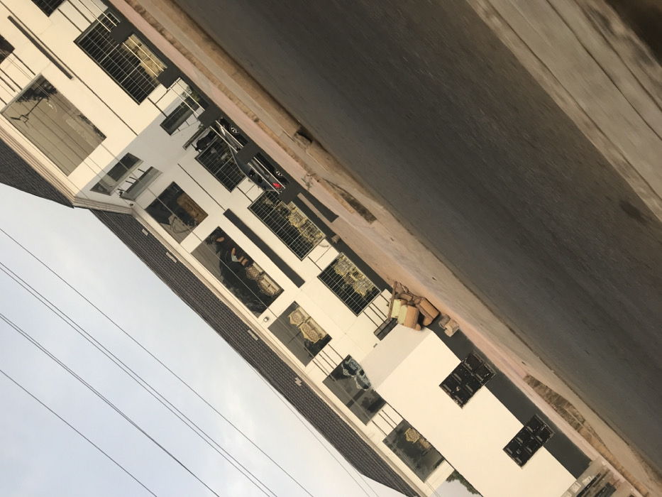 This image depicts a multi-story commercial building situated alongside an asphalt road in Jos, Nigeria. The building, rendered in a predominantly white facade with dark grey or black accent trim, features a dark grey sloped roof and multiple large rectangular windows across at least two visible floors. Several windows on the lower levels are protected by decorative gold-colored grates or railings. Through the windows, various pieces of light-colored, ornate furniture, including sofas and chairs, are displayed, indicating a potential furniture showroom. Two dark, rectangular doors are visible on the ground floor toward the left side of the structure. A dark-colored sedan or small SUV is parked parallel to the concrete curb separating the building from the street, with its rear portion visible. To the left of the parked vehicle, against the building's base, a stack of several light-colored, rectangular items, possibly packaged materials or goods, rests on the ground. Overhead power lines are visible against a light, possibly overcast, sky in the upper left quadrant. The entire scene is captured with a strong diagonal tilt, making the building appear to lean upwards from right to left. No individuals are clearly visible.