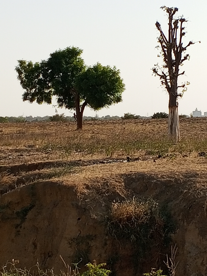 The scene depicts an open, dry landscape within Rangaza, Nigeria, under a clear, bright sky. A prominent reddish-brown earthen embankment with sparse dry vegetation and some green shoots occupies the foreground. The midground consists of an expansive field characterized by dry, light brown stubble and exposed soil, marked by visible furrows and scattered dark debris. Two distinct trees are present: a healthy, full tree with dense green foliage and a brown trunk stands on the left, while a taller, slender, mostly denuded tree with numerous truncated branches and a lighter-colored lower trunk (possibly stripped bark or painted) is positioned to the right. The distant horizon reveals faint scrubland and indistinct light-colored structures, possibly buildings, on the far right. No people or active subjects are visible within the frame.