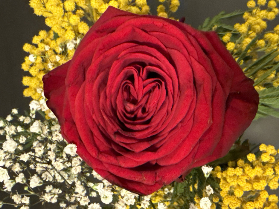 A captivating close-up reveals a velvety red rose in full bloom. Its tightly spiraled petals create a heart-like center, radiating outward with subtle imperfections. The rose is surrounded by delicate sprigs of white baby's breath and vibrant yellow mimosa flowers, creating a striking color contrast. The background is a muted gray.
