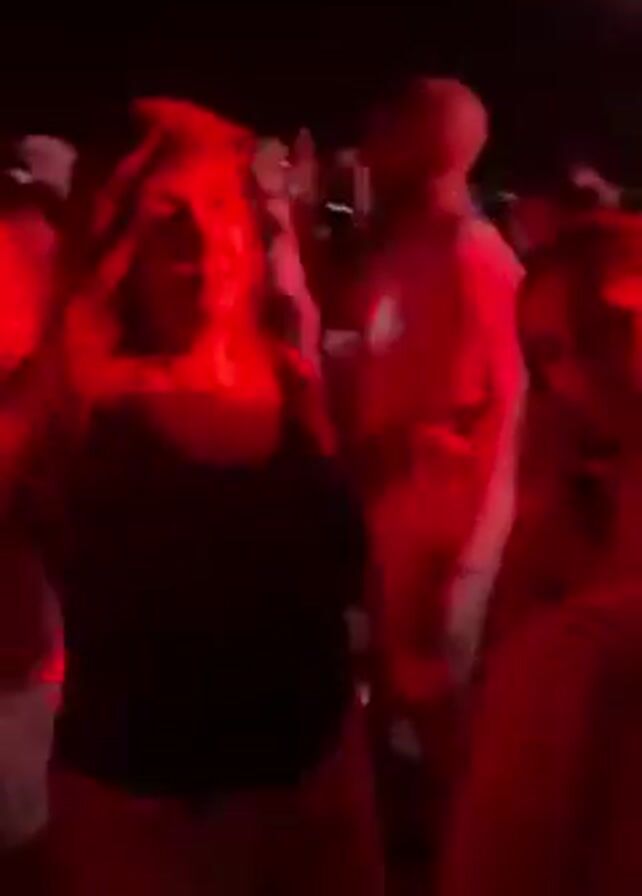 A group of people are dancing at a nighttime outdoor party. They are close together and moving to the music. The lighting is changing colors including blue, pink, and green. Some people are holding drinks. One woman in the foreground is wearing a black tank top and white shorts. Another woman is wearing a white crochet sweater. A man in a white t-shirt is behind them.
