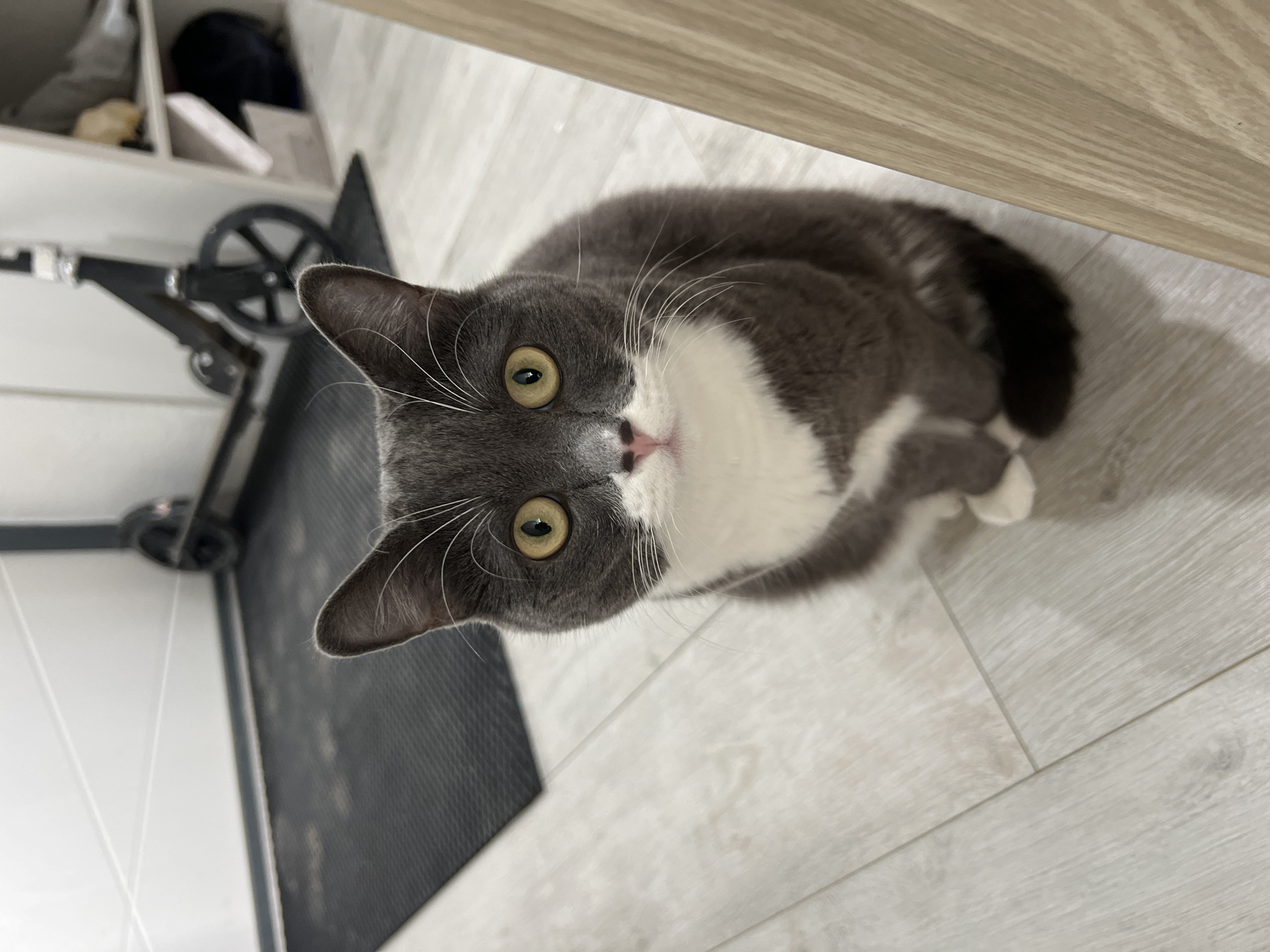 A gray and white cat with yellow eyes is looking up at the camera. The cat is on a light-colored, wood-look floor. A black scooter and a white cabinet are visible in the background. The image was likely taken in Tyumen, Russia.