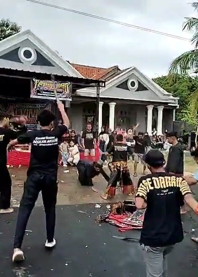 A crowd of people gathers around an outdoor performance area in front of a home, featuring a dance with performers in black shirts, pants, and shoes. One person wears traditional yellow and black attire. Other participants wear black shirts with writing on the back, grey pants, and hats. The performance area has a red blanket and ornate headgear on the ground. Overhead, a banner reads "ALVINA MUSIKA" and another sign contains the phrase "Paguyuban MURTAD." The home behind the group has white columns, a gray exterior, and decorative window trim. The street is paved and dotted with litter. People are watching the dance, and some record with their phones. The sky is overcast, hinting at an overcast day.