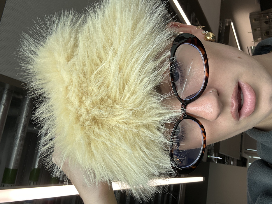 An individual is depicted in a close-up portrait, located in the city of Garston, United Kingdom. The subject's face is centered, viewed from the chest up, with a direct gaze towards the camera. They possess light blonde, spiky hair, portions of which are held upwards by a visible hand on the left side of the head. The individual wears oval-shaped glasses with tortoise-shell frames and clear lenses, revealing light blue eyes. A small silver-colored hoop nose ring is present on the left nostril. The lips are slightly parted. The right ear features multiple piercings, including a gold-colored stud and an additional, smaller earring. The background is an out-of-focus indoor setting, characterized by visible linear fluorescent light fixtures and indistinct shelving or structural elements.