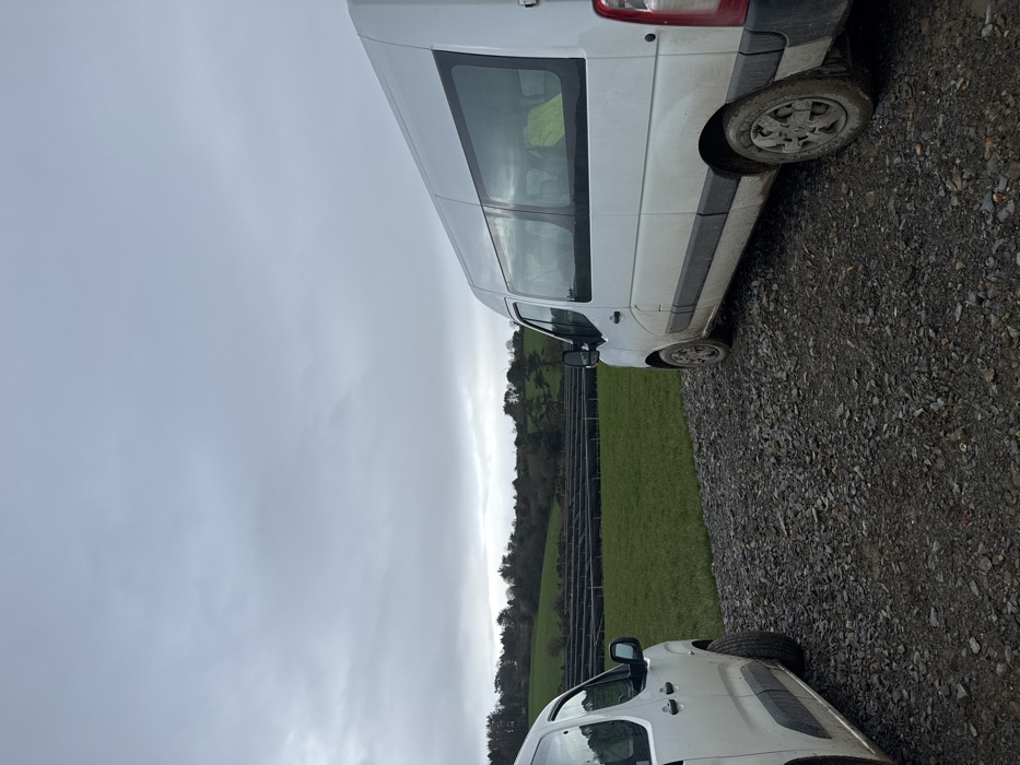 The image displays two white commercial vehicles stationary on a gravel surface in Ballinvalley Lower, Ireland, under an overcast grey sky. A partially visible smaller white van, consistent with a compact commercial vehicle, occupies the left foreground, facing right. A larger white panel van or minibus, displaying accumulated dirt and mud on its lower body and wheels, is positioned in the right foreground, facing left. A bright yellow object is visible through a rear passenger window of the larger van. Between the vehicles, the gravel transitions into an expansive, vibrant green grassy field. Within this field, in the mid-ground, a large array of parallel, low-lying dark structures, possibly solar panels or agricultural netting, is visible. The background consists of a dense line of trees at the base of rolling hills, extending towards the horizon under the uniform cloud cover. No individuals are present, and no active movements or interactions are depicted.