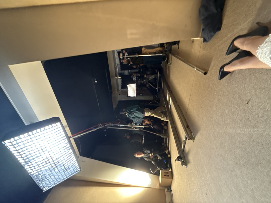 A film set is visible. A large, square softbox light fixture hangs to the left. A dolly track runs through the center of the frame, with a camera crew positioned alongside it. The crew members appear to be setting up a shot. In the upper right corner, a pair of black high heels and a portion of a white dress can be seen.