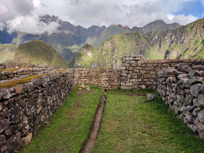 Stone walls enclose a grassy area, possibly ruins, with a narrow dirt trench running through the grass. In the background, lush green mountains rise under a cloudy sky. A faint rainbow is visible above the mountain peaks. The stone walls are weathered, with some sections covered in moss. The area appears to be part of an ancient construction.