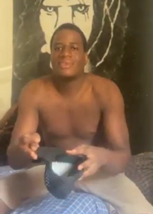 A shirtless Black man is sitting on a bed, holding a black baseball cap. He smiles, puts the cap in his mouth, and pulls it out. Behind him, a woman sits holding a phone. There is a painting of a man with long hair on the wall behind them. The man is wearing light-colored shorts. The bed has a blue and white patterned cover.