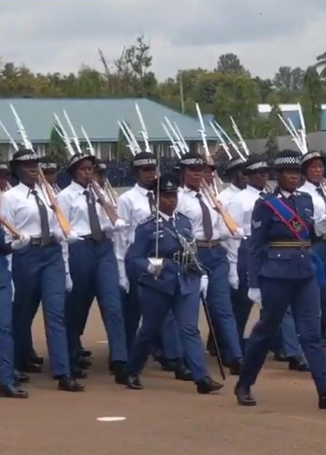 A group of people, mostly women, in military uniforms march in formation across a brown, open field. They wear dark blue pants, light blue jackets or white shirts, and hats. Some hold rifles with bayonets fixed. The group includes officers wearing swords. They march in synchronized steps. In the background, there are buildings and rows of more people in uniform. The sky is overcast. A camera on a tripod is visible in the foreground, recording the scene.
