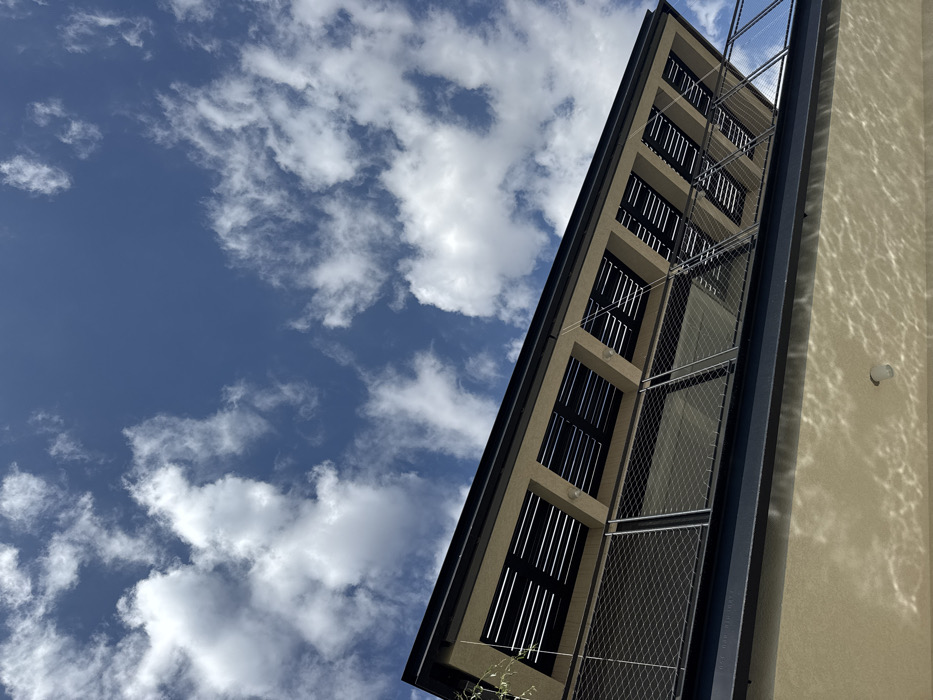 - "An exterior, low-angle photograph depicts the upper section of a modern architectural structure under a clear blue sky with scattered white cumulus clouds" by FM-d0N9Y2, licensed under CC BY 4.0