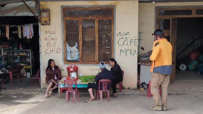 In Phát Chi, Vietnam, an outdoor scene unfolds before a weathered, light-colored building facade. Four individuals are present: three seated and one standing. On the far left, a corrugated metal awning extends over a dark recess. Beneath it, various packaged goods hang from a line, and a glass display cabinet containing items is visible. An electrical meter box is mounted high on the wall. Below it, handwritten brown text states "Mùa HỒNG BƠ / CHUÔI". Centrally, a large, dark-framed window with three panes and obscured glass dominates the facade. To the right of the window, green handwritten text reads "Mua CAFÉ MOKA". An open doorway on the far right leads to a dark interior, where several large sacks (blue, red, and green) and a white mechanical scale are visible on the floor. An electrical fixture is mounted above the doorway. At ground level, a light-colored, unpaved surface extends across the scene. A rectangular, light blue table with a metal frame is positioned centrally, laden with fresh green leafy vegetables or herbs. On the table, near the window, are several white ceramic teapots/kettles and a red woven plastic basket. Four small, maroon-colored plastic chairs are distributed around the table area. An adult female with dark hair is seated on a maroon plastic chair on the far left, leaning against the wall. She wears a plaid maroon and beige jacket over a light top and a patterned skirt, with light-colored slip-on shoes, and observes the central group. At the blue table, an adult individual wearing a patterned blue and white head covering, a dark blue long-sleeved top, and dark pants/shorts is seated barefoot on a maroon plastic chair with their back to the camera, engaged with the greens on the table. Adjacent to this individual, an adult female with dark hair, wearing a dark long-sleeved top and dark pants, is seated on another maroon plastic chair, facing and interacting with the first seated individual. Her arm rests on the back of the other's chair. On the far right, an adult male, appearing Caucasian, stands with his back largely to the camera. He wears a dark baseball cap, a two-toned yellow and grey long-sleeved jacket with a "SKE" logo on the left sleeve, light brown cargo pants, and robust, light-colored boots. He is positioned near the open doorway, observing the scene. The environment is bright daylight.