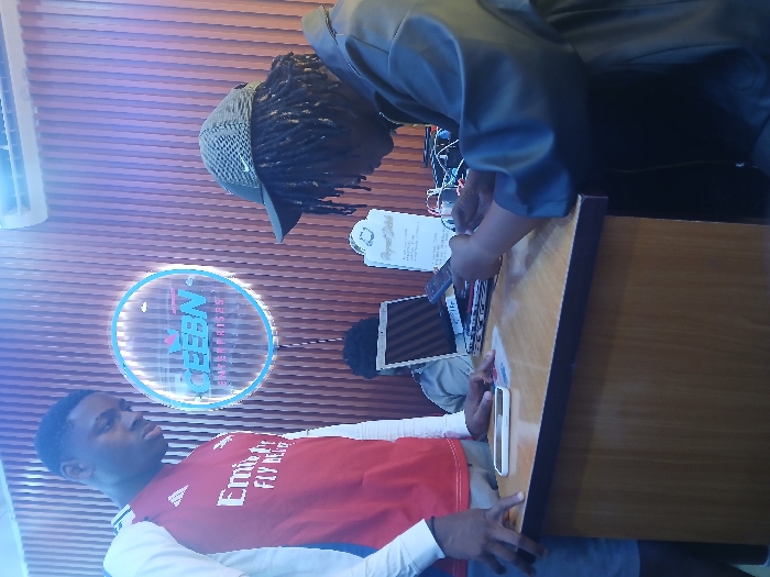 The image depicts an interior scene at CEEBN ENTERPRISES in Jos, Nigeria, featuring three individuals positioned around a wooden counter