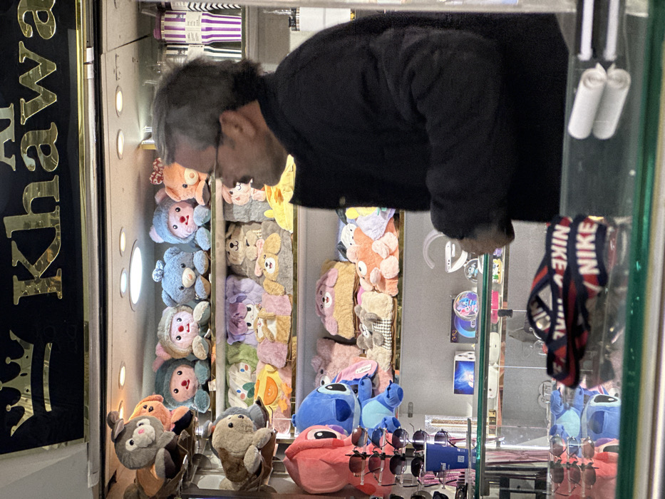 The scene depicts the interior of a retail establishment in Barza Municipality, Syria. A male subject, appearing middle-aged with graying hair, a mustache, and eyeglasses, is positioned on the right side of the frame, facing left, partially obscured by a counter. He wears a dark jacket, and his mouth is slightly open. Behind the subject, multiple illuminated shelves display various plush items, including character hats designed as animals and figures, and soft toys, such as a blue Stitch character plush and a red octopus-like plush. A black sign with gold lettering spelling "Al Khawa" and a crown emblem is visible above the top shelf. On the reflective glass counter in the foreground, a dark blue and red lanyard with "NIKE" in white lettering and a small white cylindrical object are present. A vertical display stand holding multiple sunglasses is partially visible on the far left.