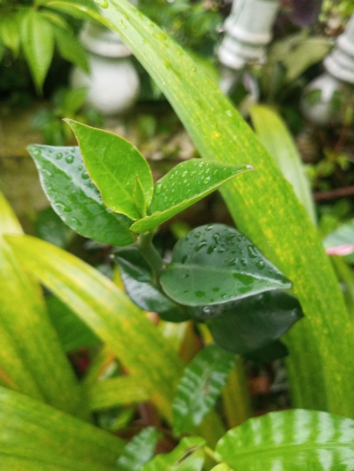 Lush green leaves, covered in tiny water droplets, fill the frame. Narrow, yellow-striped leaves provide a textured backdrop. The glossy, rounded leaves of a small plant are centrally featured, their vibrant green hue contrasting with the muted greens surrounding them. Hints of a white balustrade suggest a garden or outdoor setting, complementing the fresh, natural scene.