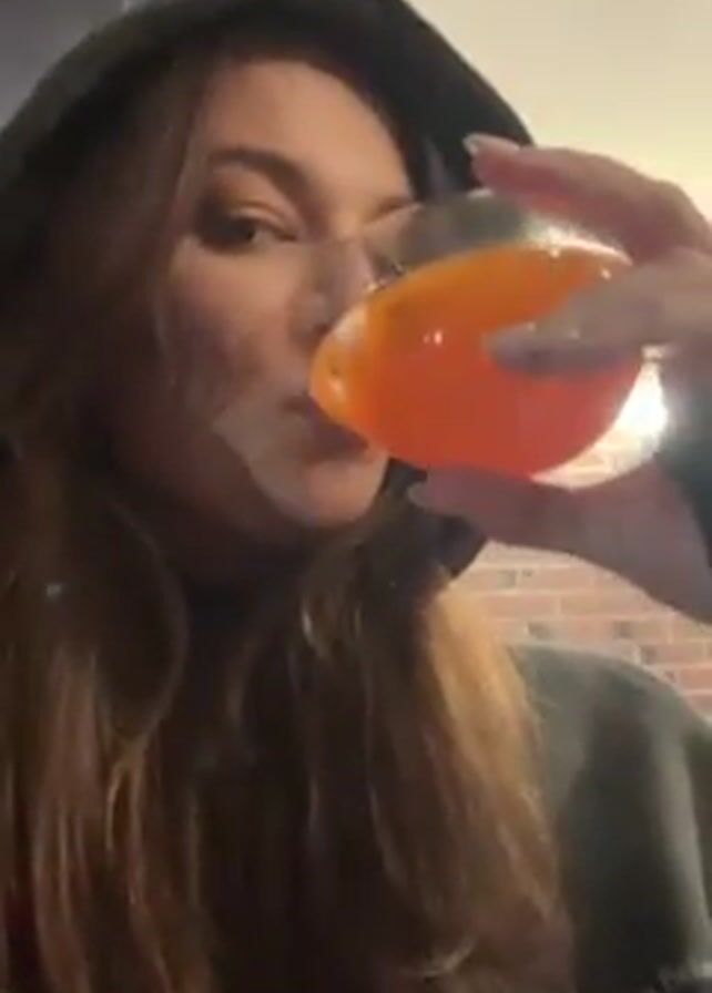 A woman is seen drinking a glass of orange liquid while wearing a black hooded sweatshirt. She has long brown hair and fair skin. The background appears to be an indoor space, possibly a garage or storage area, with visible brick wall segments. The lighting is somewhat dim and the camera angle is from a slightly low perspective. The woman pauses after drinking to make a kissing gesture towards the camera.