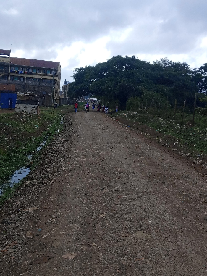 A dirt road stretches into the distance, flanked by overgrown vegetation and a drainage ditch on the left. In the background, a large tree dominates the scene, under which a group of people walk. To the left, a multi-story building stands adjacent to what appears to be a shanty town. The sky is overcast, suggesting a cloudy day.