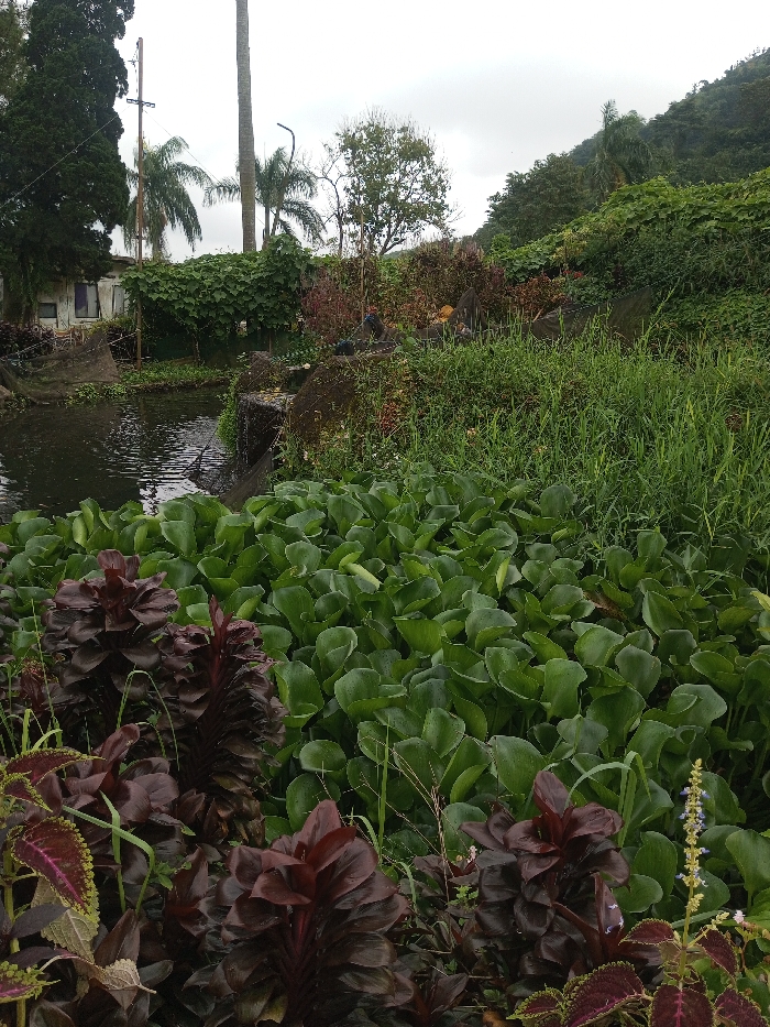 This image depicts a lush, overgrown outdoor scene in Nuwara Eliya, Sri Lanka, under an overcast sky. In the foreground, a dense array of dark maroon and reddish-brown broad-leaved plants with vertical growth patterns is visible, interspersed with variegated green, purple, and yellow-leafed plants. A thin stalk with small, light purple-white flowers emerges on the lower right. Directly behind these plants, a large expanse of vibrant green, rounded-leaf aquatic vegetation, consistent with water hyacinth, covers a significant portion of a dark body of water. In the midground, to the left, a section of open, dark water is visible, with dark nets partially submerged or draped along its edge. A small cascade of water flows over a dark, rocky or concrete structure into the main water body. To the right of the water, a patch of tall green grass and weeds leads to an area of mixed vegetation, including some reddish-brown bushes and darker green foliage. Within this vegetation, two indistinct, static figures resembling peacocks, one dark and one with blue-green hues, are positioned, likely as statues or decorations. The background on the left features a light-colored building with visible windows, partially obscured by dense green foliage, a tall utility pole, and several trees, including a prominent conifer-like tree and multiple palm trees. The background on the right is dominated by a steep hillside or mountain covered in dense, dark green foliage, indicating a natural, hilly landscape. The sky is uniformly light grey and overcast. No human figures are present or discernable.