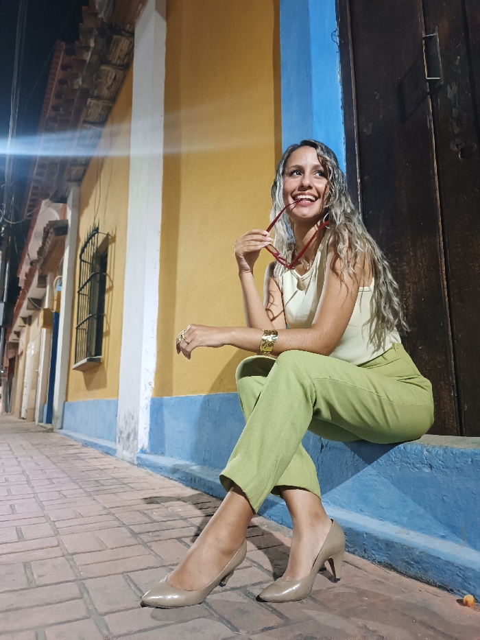 A smiling woman sits on a ledge wearing a light yellow tank top, light green pants, and beige heels. She holds red-rimmed glasses to her mouth. A gold bracelet and rings adorn her left hand. Behind her is a colorful building façade with yellow, white, and blue sections, and a dark wooden door to the right. The brick-paved street extends into the darkness to the left. The lighting suggests it is nighttime.