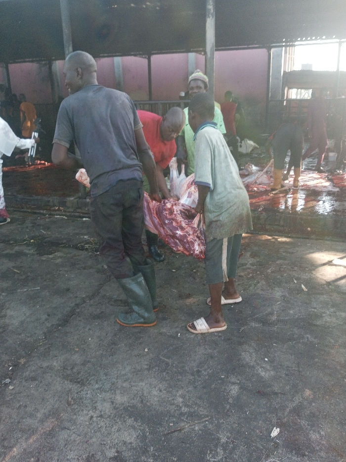 In an outdoor setting, three men carry a carcass of meat. The man on the left wears a blue shirt and green boots. The middle man wears a red shirt. The man on the right wears a light green shirt and white sandals. Other figures are visible in the background, and the ground appears wet, possibly with blood. They are likely at a slaughterhouse or butchery.