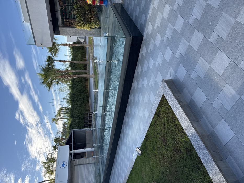 The image depicts an outdoor area in Majjate, Morocco, characterized by modern landscaping and architecture under a clear blue sky with sparse white clouds. In the foreground, a light grey-toned tiled pavement, featuring a pattern of alternating square and rectangular tiles, extends from the lower left towards the upper right. To the immediate left, a raised planter box with green grass and a small solar light is bordered by grey granite-like trim. Dominating the midground is a long, rectangular water fountain, its basin filled with disturbed water from multiple active jets spraying upwards. The fountain is enclosed by a clear glass barrier atop a dark, possibly black, raised base. To the left of the fountain, a white building with a closed roll-down security shutter is visible. A circular blue sign with a white fish icon is affixed to its facade. An adjacent covered outdoor seating area with dark tables and chairs is located behind this structure. To the right of the fountain, a contemporary white building features dark architectural elements and a prominent vertical garden (living wall) on one section. A glass balustrade is visible on an upper level of this building. To its immediate right, a stack of colorful, oversized plastic children's toys or blocks is present. The background features a dense green hedge or wall of foliage, beyond which numerous tall palm trees and slender, bamboo-like poles rise towards the sky. No individuals are present within the scene.