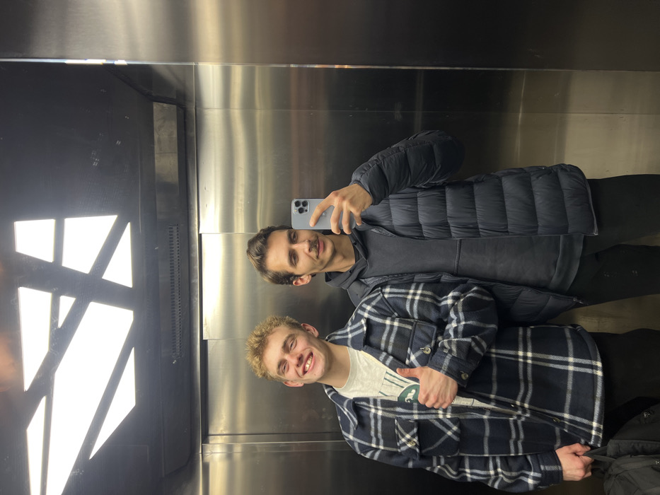 Two men are captured in a selfie within an elevator. One man, with dark hair and a slight mustache, holds the phone, wearing a dark puffer jacket over a dark shirt. The other man, with light, curly hair, gives a thumbs-up, clad in a navy and white checkered shirt over a light tee. The elevator features stainless steel walls and bright, geometric lighting on the left side. A bag is visible near the bottom of the frame.