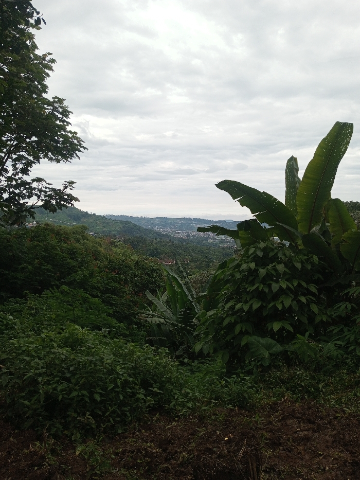 The image displays a panoramic view of a verdant landscape overlooking a distant city, located within Hasanparthy mandal, India. The foreground consists of dark, tilled earth with scattered green ground cover. The midground is dominated by dense, lush green vegetation, including a tree with dark foliage partially obscuring the upper left, and a prominent plant with large, broad, torn green leaves on the right. Beyond the immediate foliage, rolling hills covered in dense greenery extend into the distance. A cluster of urban structures and buildings is visible on the distant horizon, situated among the hills. The sky is overcast with a blanket of grey and white clouds. No people, specific actions, or interactions are discernible.