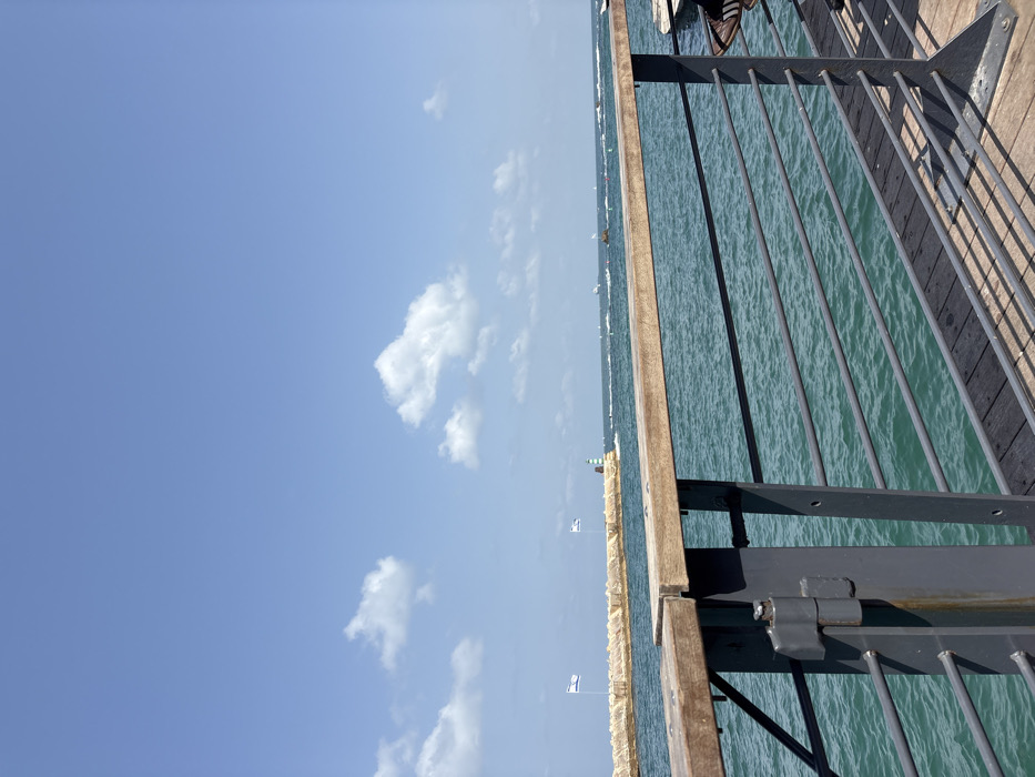 The image displays a daytime view from the Tel Aviv Port (Namal Tel Aviv), Israel, looking out over the Mediterranean Sea. In the immediate foreground, a dark gray metal railing with a light brown wooden handrail extends horizontally across the lower third of the frame. The railing consists of vertical posts and horizontal bars. Part of a dark wooden deck with parallel shadows is visible beneath the railing on the right. A human foot, wearing a brown and white striped shoe, is partially visible on the far right of the deck. The midground features the turquoise-colored sea with minor surface ripples. A rocky breakwater, light in color, extends from the left towards the center. Two Israeli flags, blue Stars of David on white fields, are mounted on poles along the breakwater. A small green and white lighthouse or navigation beacon is positioned at the visible end of the breakwater. Multiple small boats and watercraft are discernible on the distant sea, some producing white wakes. The background consists of a clear, light blue sky scattered with several white cumulus clouds. The horizon line where the sea meets the sky is visible. The scene is illuminated by bright sunlight.