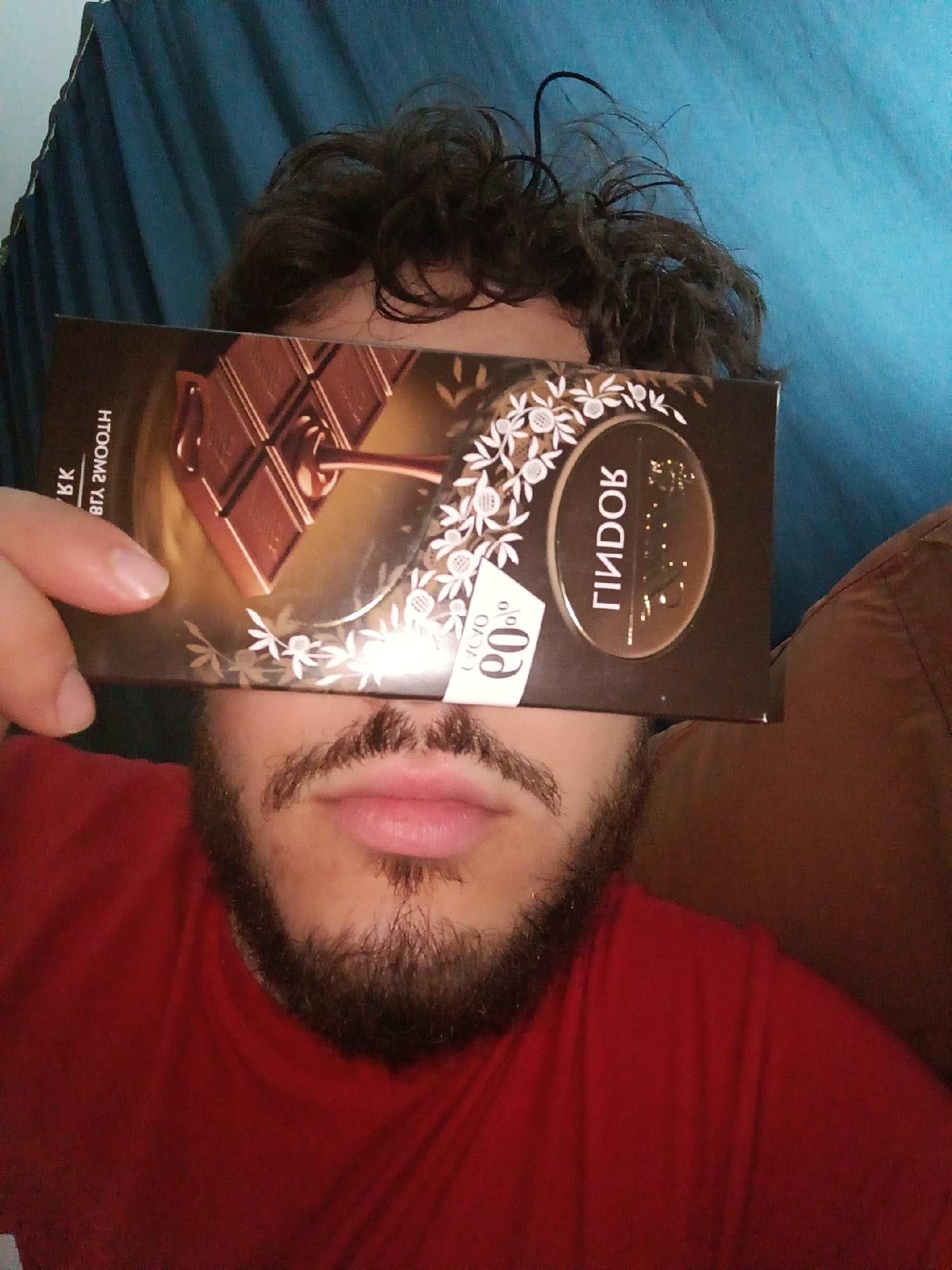The image is a close-up, indoor portrait, reportedly taken in the city of Roman, Bulgaria. It features an individual holding a dark brown, rectangular chocolate bar wrapper horizontally across their face, obscuring the eyes and forehead. The subject has dark, curly hair visible at the top, a mustache, and a beard covering the chin and jawline. The visible skin appears light-toned. The individual is wearing a red short-sleeved garment. A left hand, with visible fingers and short, unpainted fingernails, grasps the left side of the chocolate wrapper. The wrapper displays gold design elements including a stylized chocolate bar segment and a central oval with prominent mirrored Cyrillic text reading "ГИПОВ" (GIPOV). White botanical motifs decorate the wrapper, particularly around the oval. On the left side of the wrapper, also mirrored and rotated clockwise, are the Cyrillic letters "K" and "HTOOM2" (SMOOTH). A white sticker is adhered to the lower left of the wrapper, showing "CACY" (COCO) and "EO%" (90%). The background on the left side of the image consists of a textured, folded blue fabric, while the background on the right is a darker brown, possibly another fabric or wall surface.